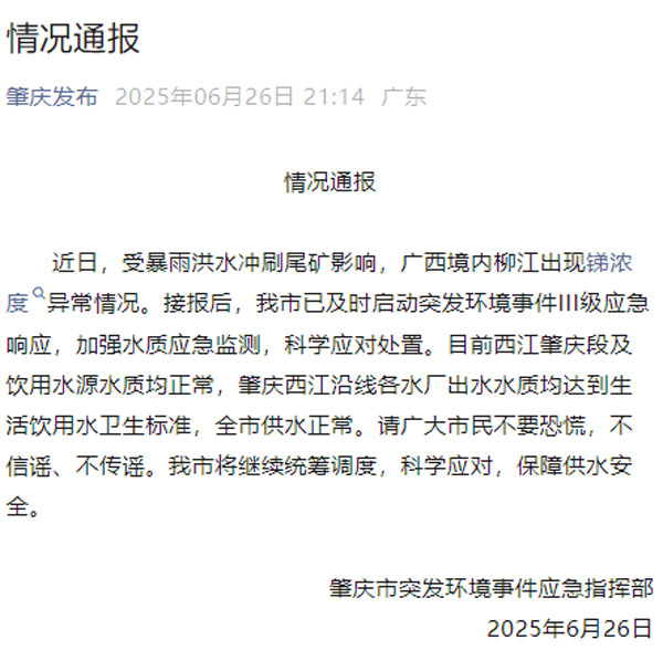 近日,受暴雨洪水沖刷尾礦影響,廣西境內(nèi)柳江出現(xiàn)銻濃度異常情況。接報后,我市已及時啟動突發(fā)環(huán)境事件III級應(yīng)急響應(yīng),加強(qiáng)水質(zhì)應(yīng)急監(jiān)測,科學(xué)應(yīng)對處置。目前西江肇慶段及飲用水源水質(zhì)均正常,肇慶西江沿線各水廠出水水質(zhì)均達(dá)到生活飲用水衛(wèi)生標(biāo)準(zhǔn),全市供水正常。請廣大市民不要恐慌,不信謠、不傳謠。我市將繼續(xù)統(tǒng)籌調(diào)度,科學(xué)應(yīng)對,保障供水安全。
