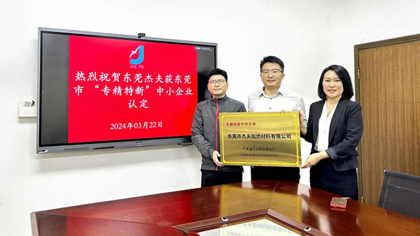 3月22日,東莞市“專精特新”企業(yè)聯(lián)合會(huì)一行來東莞杰夫阻燃材料有限公司開展“企業(yè)授牌及走訪調(diào)研”并舉行授牌儀式,東莞杰夫總經(jīng)辦主任李康、財(cái)務(wù)經(jīng)理封東弟參加授牌儀式,并與專精特新企業(yè)聯(lián)合會(huì)就政策支持、開展市場(chǎng)拓展、產(chǎn)業(yè)鏈上下游對(duì)接合作,提供技術(shù)咨詢及產(chǎn)學(xué)研合作,搭建融資橋梁解決融資難題展開了深入的交流。